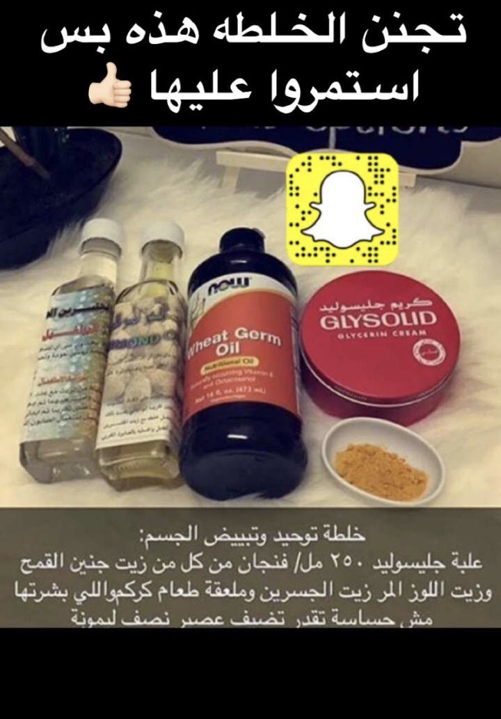 خلطه توحيد وتبيض الجسم : علبة جليسوليد ٢٥٠ مل / فنحان كلاً من زيت جنين القمح ، زيت اللوز المر ، زيت الجسرين ، ملعقة كركم ( الي بشرتها مو حساسه تقدر تضيف عصير نصف ليمونه )