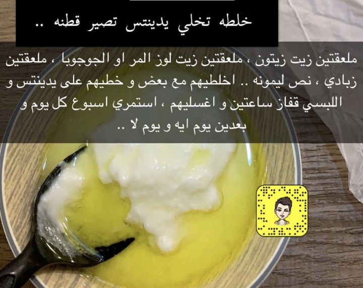 خلطه تخلي يدينك تصير قطنه : ملعقتين زيت زيتون ، ملعقتين زيت اللوز المر او الجوجوبا ، ملعقتين زبادي ، نص ليمونهه ، اخلطيهم مع بعض وحطيهم على يدينك والبسي قفاز ساعتين واغسليهم ، استمري اسبوع كل يوم وبعدين يوم اي ويوم لا