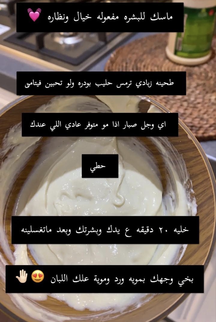 ماسك (1)للبشره مفعوله خيال ونظاره : طحينه ، زبادي ، ترمس ، حليب بودره ، ولو تحبين فيتامين (E) ، جل صبار (خليه لمدة 20 دقيقه على يدك وبشرتك وبعد ماتغسلينه بخي عل وجهك بمويه ورد وموية علك اللبان )