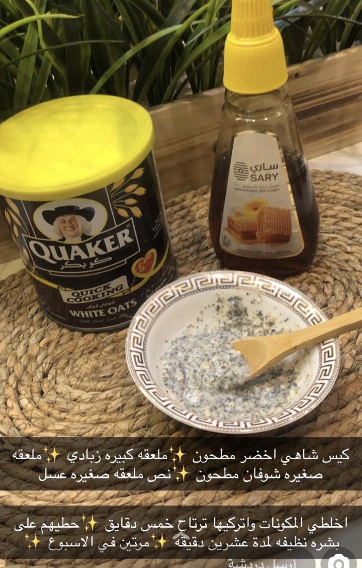 ماسك 6 : كيش شاهي اخصر مطحون ، ملعقه كبيره زبادي ، ملعقه صغيره شوفان مطحون ، نص ملعقه صغيره عسل ( اخلطي المكونات وات كيها ترتاح 5 دقايق ، حطيهم على بشره نظيفه لمدة 20 دقيقه ، مرتين بالاسبوع )