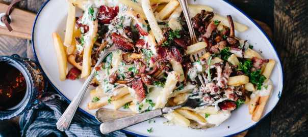 أعلم ذلك، ما الذي يمكن أن يكون أفضل من طبق بطاطس مقلية مطهو بالبخار ومرق وجبن رائب؟ البطاطس المقلية، والمرق، والجبن الرائب واللحم مقدد، هذا الأفضل! أضف بعضًا من الكراث الطازج والفلفل الحار وقليلاً من نخاع العظم المحمَّص ومرقة البط، وسنحول هذا الطبق الفرنسي الكندي المشهور إلى وجبة راقية.